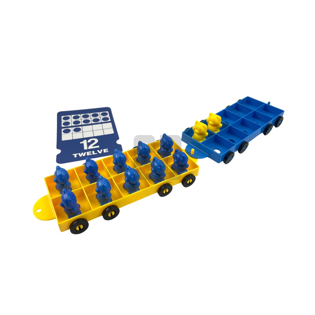 The Ten-Frame Math Train is a comprehensive educational tool designed to facilitate early mathematics learning through structured, hands-on engagement. This meticulously crafted set features six interconnecting ten-frame train pieces accompanied by 60 bear counters, enabling systematic practice of fundamental arithmetic concepts. The included full-color activity booklet provides structured learning progressions, while 20 double-sided train ticket cards present progressive mathematical challenges. Enhanced by specialized dice and a ten-frame spinner, the set incorporates multiple learning modalities for optimal skill development. The transparent number overlays further reinforce numerical recognition and understanding. This pedagogically sound resource effectively combines systematic instruction with engaging manipulatives to create a robust foundation in early mathematical concepts.